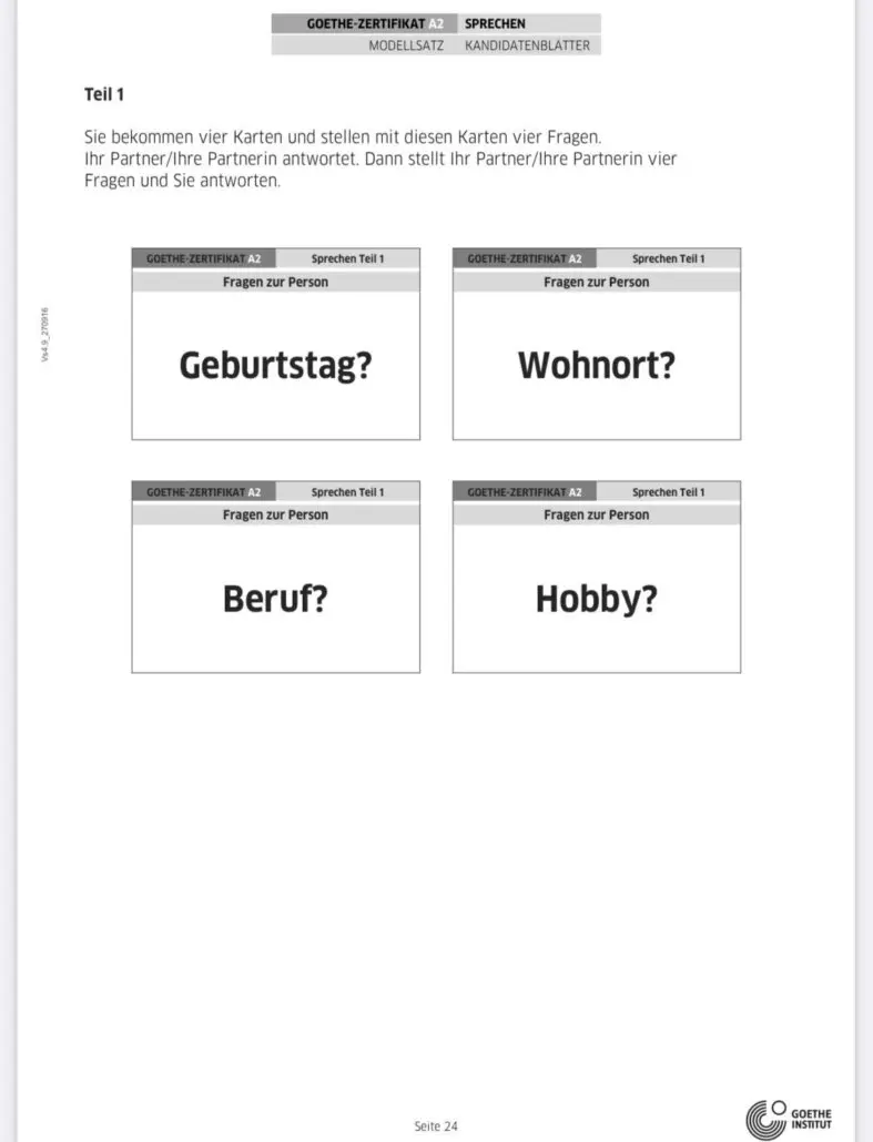 Theo đề thi A2 tiếng Đức Goethe, bạn sẽ nhận được 4 thẻ như trên. Bạn sẽ cầm những tấm thẻ này và hỏi partner của mình theo gợi ý trong những tấm thẻ. Mỗi thẻ tương ứng với một câu hỏi.